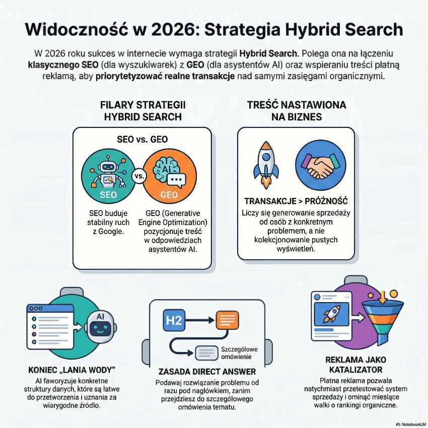 Aby wygrywać w świecie zdominowanym przez algorytmy, musisz stosować strategię Hybrid Search: optymalizować treści pod klasyczne wyszukiwarki (SEO) oraz asystentów AI (GEO), a wartościowe materiały wspierać płatną reklamą. Skupienie się wyłącznie na zasięgach organicznych to dzisiaj ryzykowna gra – w biznesie eksperckim liczy się generowanie transakcji, a nie kolekcjonowanie wyświetleń.